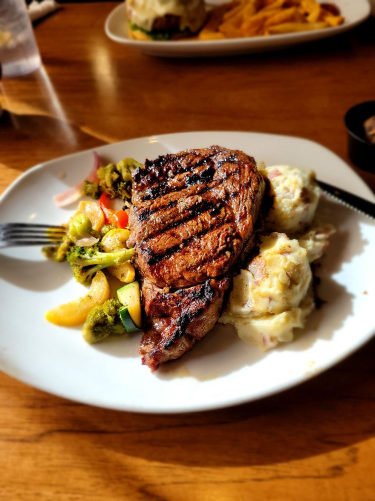 12 oz ribeye, grilled mushrooms, roasted vegetables, mashed potatoes.