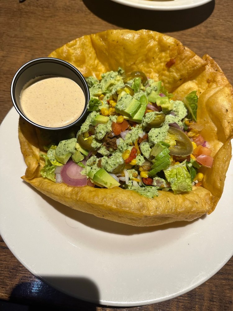 Sliced sirloin & ribeye, fresh avocado, pico de gallo, roasted corn salad, lime-pickled red onion, lettuce, cilantro lime crema.